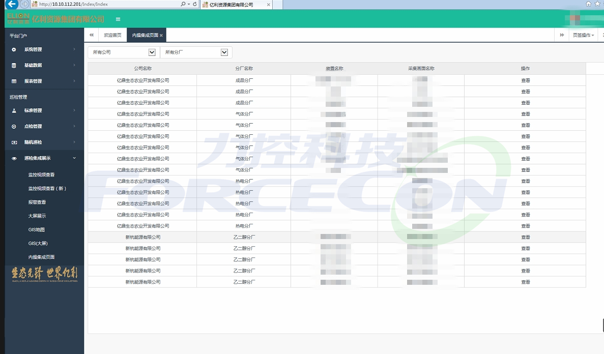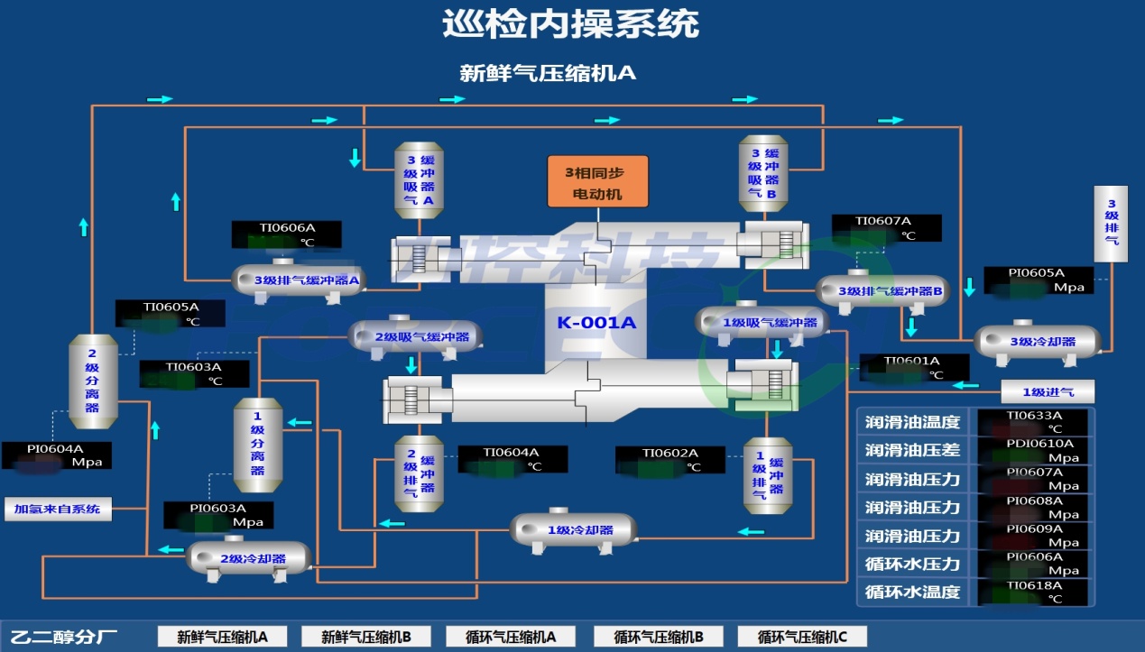本次項目的實施范圍覆蓋庫布齊園區(qū)生產(chǎn)基地3個分廠,共計43條巡檢路線。內(nèi)操巡檢平臺則主要是針對這43條路線中的重點(diǎn)巡檢路線上重點(diǎn)裝置,設(shè)備和重大危險源進(jìn)行集中監(jiān)控管理。監(jiān)控畫面35幅,監(jiān)控點(diǎn)位360余個。系統(tǒng)依托pSpace實時數(shù)據(jù)庫平臺,自動記錄各測控點(diǎn)位的實時數(shù)據(jù)。并根據(jù)工藝要求,配置各測點(diǎn)的報警信息。智能巡檢平臺通過標(biāo)準(zhǔn)接口實時讀取pSpace數(shù)據(jù)庫中各監(jiān)控點(diǎn)位產(chǎn)生的報警信息。并將報警信息與現(xiàn)場監(jiān)控視頻綁定。當(dāng)報警產(chǎn)生后,視頻監(jiān)控自動切換到對應(yīng)的巡檢點(diǎn)監(jiān)控畫面。同時智能巡檢平臺能對各巡檢點(diǎn)產(chǎn)生的報警信息進(jìn)行統(tǒng)計分析,為現(xiàn)場檢修人員制定設(shè)備保養(yǎng)計劃提供數(shù)據(jù)支撐。除此之外,利用Html5技術(shù),根據(jù)Fsmartworx的跨平臺特點(diǎn),實現(xiàn)內(nèi)操巡檢系統(tǒng)與智能巡檢平臺的融合。
