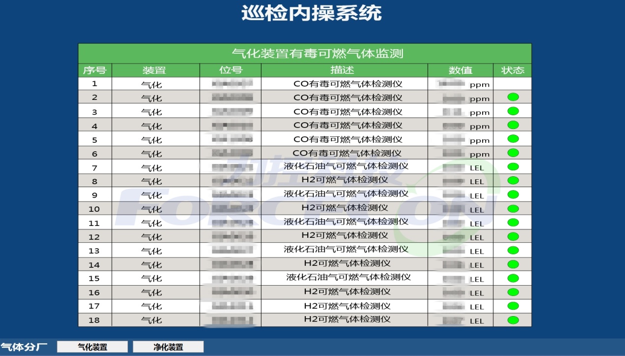 有毒可燃?xì)怏w的監(jiān)測是安全環(huán)保的重中之重,也是安全生產(chǎn)的保障。本項目中采用表格形式,直觀展示各個有毒可燃?xì)怏w檢測點(diǎn)的氣體濃度值。并根據(jù)濃度閾值,以不同顏色顯示。實現(xiàn)有毒可燃?xì)怏w濃度的集中管理。