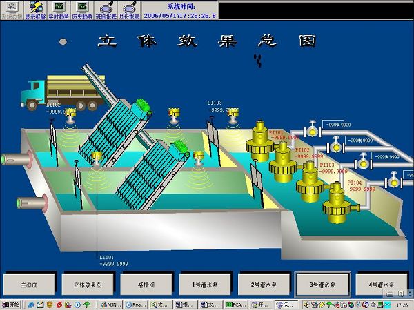 力控監(jiān)控組態(tài)軟件集控制技術(shù)、實(shí)時(shí)數(shù)據(jù)庫(kù)技術(shù)、網(wǎng)絡(luò)技術(shù)、人機(jī)界面技術(shù)、圖形技術(shù)于一身,包含動(dòng)態(tài)顯示、報(bào)警、控件、趨勢(shì)、網(wǎng)絡(luò)通訊等組件,用戶只需編寫少量代碼即可生成高質(zhì)量的控制系統(tǒng)。整套系統(tǒng)建設(shè)有多幅實(shí)時(shí)監(jiān)控畫面,包括系統(tǒng)總貌、提升泵站與除砂池、1#氧化溝、2#氧化溝、二沉池、泥路、加藥脫水間。其通過(guò)指示燈表明設(shè)備運(yùn)行狀態(tài)。在電機(jī)運(yùn)行方式為手動(dòng)時(shí),用鼠標(biāo)點(diǎn)擊畫面下排電機(jī)啟動(dòng)按鈕可遠(yuǎn)程啟動(dòng)現(xiàn)場(chǎng)設(shè)備。傳感器的瞬時(shí)值依據(jù)實(shí)際安裝位置被分別標(biāo)注到不同的分布工藝流程圖中,其實(shí)時(shí)數(shù)據(jù)和歷史數(shù)據(jù)被做成相應(yīng)分布圖的子畫面,可在分布工藝流程圖中直接點(diǎn)擊按鈕進(jìn)入。整個(gè)軟件界面呈樹(shù)狀排列,查閱、操作簡(jiǎn)便。數(shù)據(jù)庫(kù)是上位機(jī)監(jiān)控軟件的核心所在,因此依據(jù)實(shí)際需要首先將其建設(shè)好,然后將各功能模塊進(jìn)行恰當(dāng)?shù)慕M合。實(shí)際編程過(guò)程中在定義變量時(shí),記錄可設(shè)定為不記錄、數(shù)據(jù)變化時(shí)記錄和定時(shí)記錄,要根據(jù)實(shí)際情況選擇相應(yīng)的設(shè)置,從而節(jié)省存儲(chǔ)空間。報(bào)表分為實(shí)時(shí)報(bào)表和歷史報(bào)表兩種。