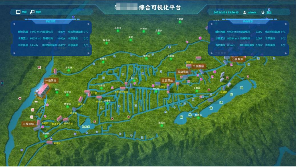 通過對泵站供水的地理位置信息進(jìn)行3D繪制,精準(zhǔn)展現(xiàn)地理布局,標(biāo)注河道位置、走向及泵站位置。該系統(tǒng)實(shí)時(shí)接入泵站的電壓、電流、流量等運(yùn)行數(shù)據(jù),通過圖表直觀展示泵站狀態(tài)。