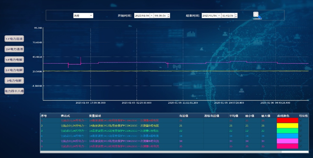 平臺采用pSpase數(shù)據(jù)庫進(jìn)行數(shù)據(jù)管理,集成ForceSCADA平臺曲線控件,實(shí)現(xiàn)整機(jī)及高壓電力系統(tǒng)數(shù)據(jù)的冗余存儲(chǔ),并通過實(shí)時(shí)/歷史曲線進(jìn)行可視化呈現(xiàn)。依托控件內(nèi)置系統(tǒng)函數(shù),支持單畫面多機(jī)組數(shù)據(jù)/曲線自由切換,結(jié)合歷史趨勢比對與動(dòng)態(tài)參數(shù)分析,可精準(zhǔn)識別設(shè)備異常波動(dòng),為設(shè)備運(yùn)行狀態(tài)監(jiān)測及故障診斷提供直觀分析依據(jù)。