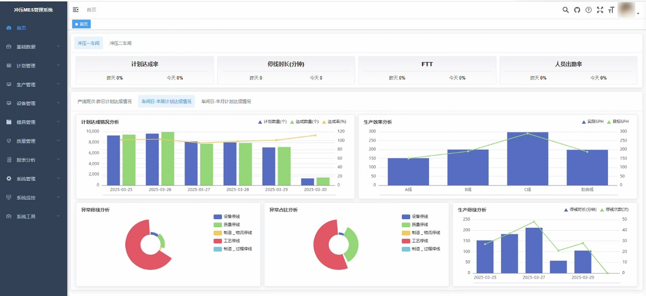 沖壓MES系統(tǒng)不僅提供車間總覽功能,實(shí)時(shí)展示各項(xiàng)管理指標(biāo),還集成生產(chǎn)監(jiān)控、計(jì)劃排程、質(zhì)量管理、設(shè)備管理、模具管理及報(bào)表分析等核心模塊,實(shí)現(xiàn)全流程數(shù)字化管控。