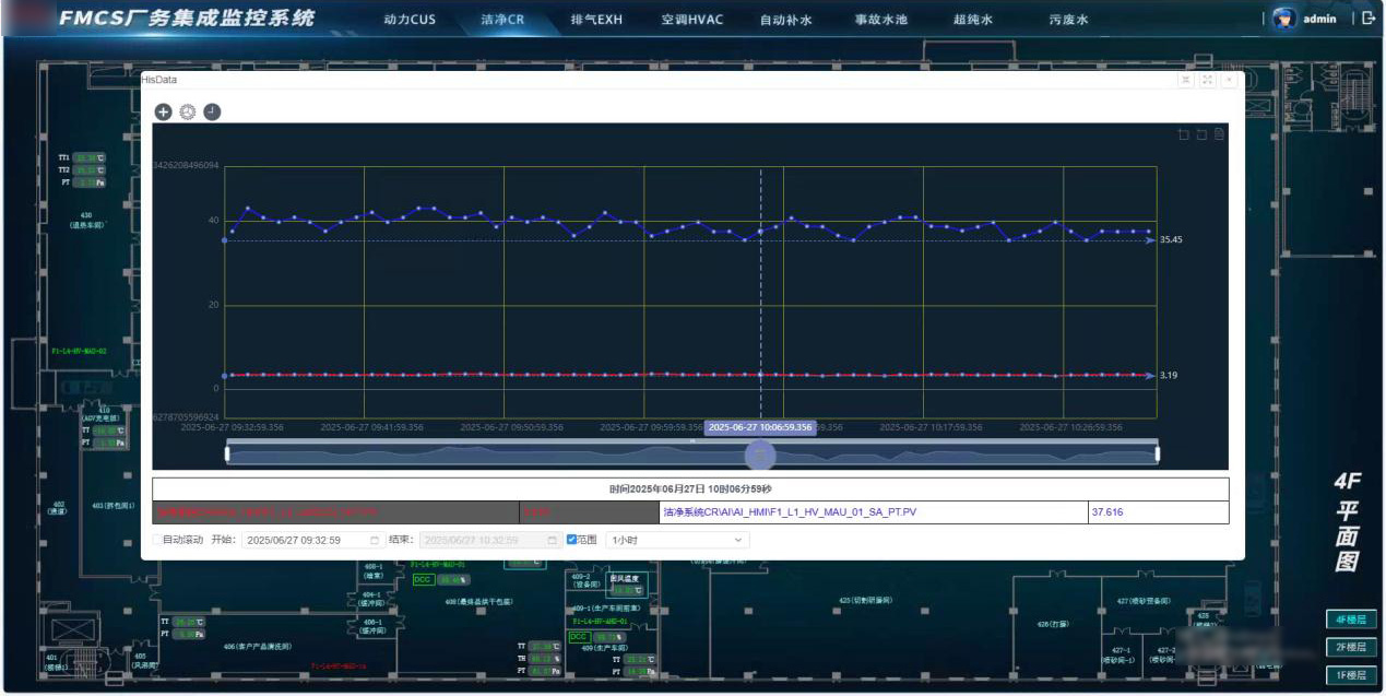 系統(tǒng)按動(dòng)力CUS、潔凈CR、排氣EXH、空調(diào)HVAC、自動(dòng)補(bǔ)水、事故水池、超純水、污廢水等八大子系統(tǒng)進(jìn)行流程可視化展示,覆蓋生產(chǎn)工藝用水、恒溫恒濕恒壓環(huán)境控制及廢氣廢水處理等環(huán)節(jié)。實(shí)時(shí)監(jiān)測(cè)運(yùn)行狀態(tài)與工藝參數(shù),優(yōu)化調(diào)節(jié)PID參數(shù),保障生產(chǎn)環(huán)境穩(wěn)定可靠。