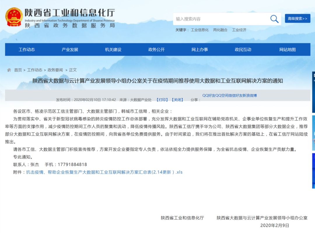 2020年2月9日,陜西省工業(yè)和信息化廳發(fā)布《陜西省大數據與云計算產業(yè)發(fā)展領導小組辦公室關于在疫情期間推薦使用大數據和工業(yè)互聯網解決方案》的通知。旨在充分發(fā)揮大數據和工業(yè)互聯網在輔助黨政機關、企事業(yè)單位恢復生產和提升工作效率等方面的支撐作用,減少疫情防控期間工作人員的聚集和流動,降低疫情傳播風險。