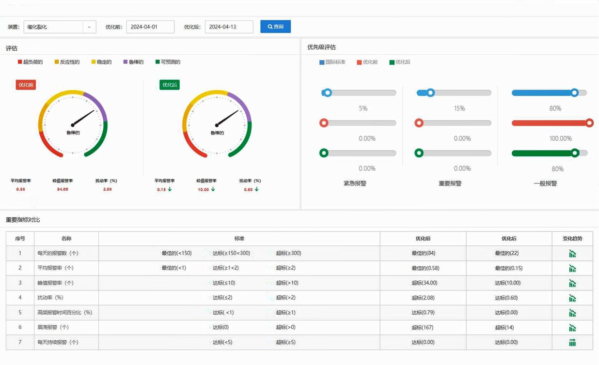 針對(duì)各裝置報(bào)警優(yōu)先級(jí)、報(bào)警次數(shù)進(jìn)行詳細(xì)統(tǒng)計(jì)和比對(duì),分析各生產(chǎn)單元平均報(bào)警率、峰值報(bào)警率、擾動(dòng)率、擱置率、確認(rèn)率、恢復(fù)率等指標(biāo),深度評(píng)估各裝置報(bào)警情況,提升報(bào)警管理水平;
