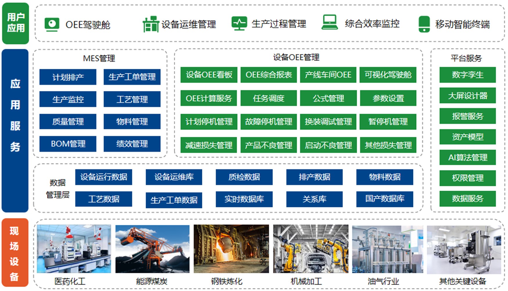 OEE計算服務(wù)能夠?qū)崿F(xiàn)可用性、性能和質(zhì)量指標(biāo)的綜合計算,形成覆蓋設(shè)備、生產(chǎn)線、車間等多層級的OEE綜合分析,運用大屏可視化、報表和數(shù)字孿生等手段實現(xiàn)數(shù)據(jù)可視化展示。