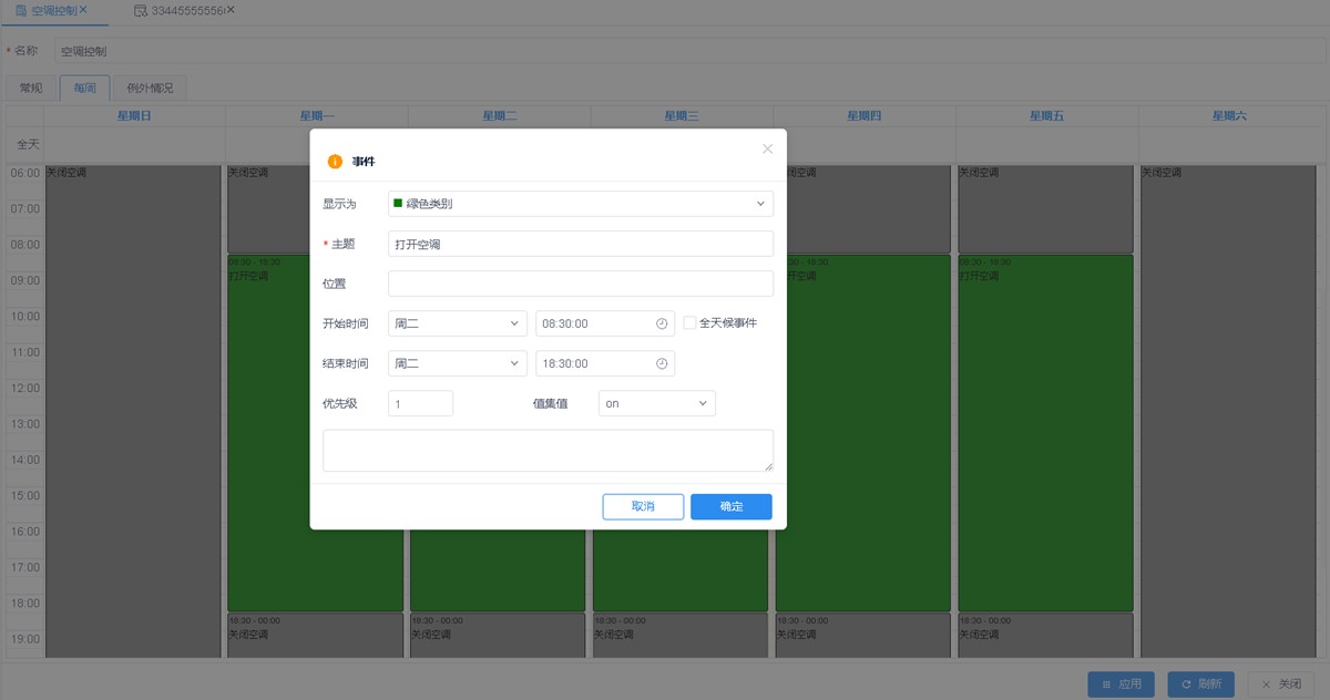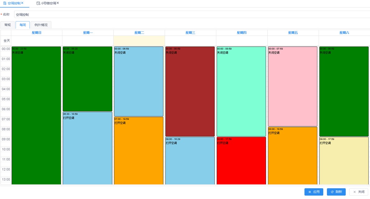 在引入時(shí)間調(diào)度表后,工廠(chǎng)可根據(jù)車(chē)間內(nèi)的溫度和濕度需求,自動(dòng)調(diào)整風(fēng)機(jī)和空調(diào)的運(yùn)行狀態(tài),在夏季高溫時(shí)段,自動(dòng)開(kāi)啟空調(diào)進(jìn)行降溫;而在冬季寒冷時(shí)段,則關(guān)閉空調(diào)并開(kāi)啟風(fēng)機(jī)進(jìn)行通風(fēng)換氣。