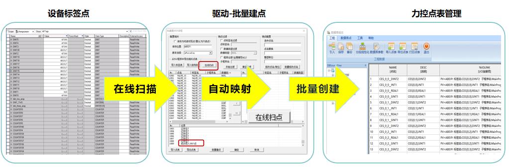 支持在線與離線兩種方式。在線模式下可直接訪問(wèn)聯(lián)機(jī)PLC,自動(dòng)掃描識(shí)別全部變量并一鍵生成力控變量表;離線模式下可接收由編程軟件導(dǎo)出的PLC變量表,通過(guò)驅(qū)動(dòng)批量建點(diǎn)功能自動(dòng)轉(zhuǎn)換為力控通用點(diǎn)表格式。