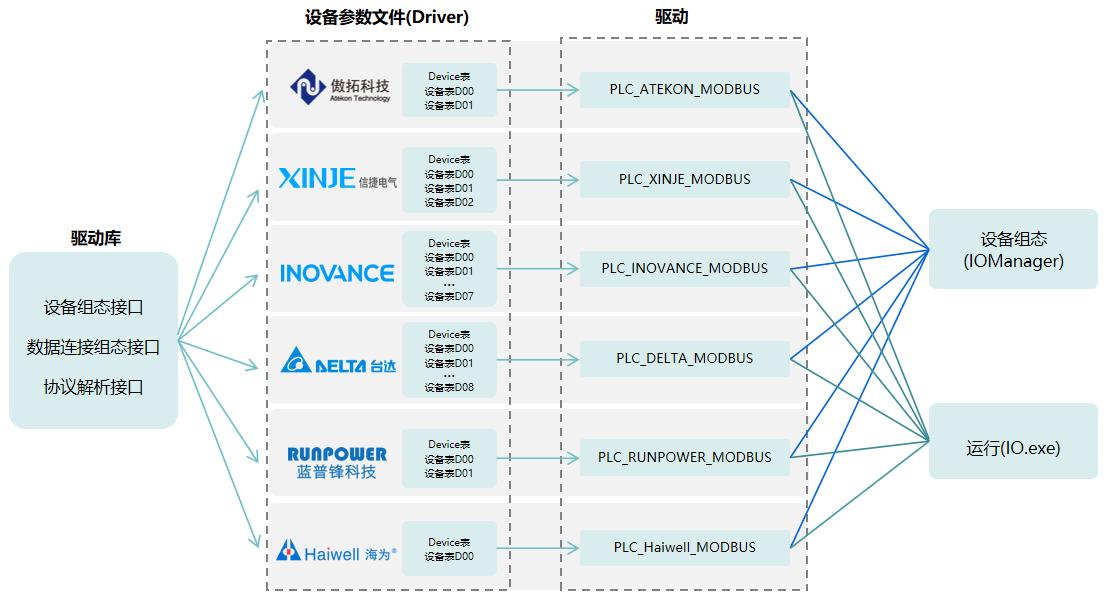 力控科技采用“公共代碼 + 配置文件”的抽象產(chǎn)品開發(fā)模式,將不同廠商PLC的通信差異通過配置文件進(jìn)行定義,代碼層則通過解析配置文件的內(nèi)容實(shí)現(xiàn)差異化處理。該模式把Modbus通信復(fù)雜的功能都封裝在代碼內(nèi)部,既節(jié)省了開發(fā)成本,又降低了工程師的使用門檻,并且實(shí)現(xiàn)國產(chǎn)PLC基于Modbus協(xié)議通信的“三快”目標(biāo):開發(fā)適配快、使用上手快、組態(tài)建點(diǎn)快。