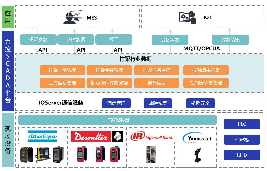 客戶使用基于OpenProtocol協(xié)議開發(fā)的驅動與擰緊設備進行通信,不僅實時監(jiān)控設備狀態(tài)與工藝參數(shù),還能接收MES工單并下發(fā)工藝參數(shù)到控制器,有效打通信息層與控制層,實現(xiàn)了IT與OT的深度融合。