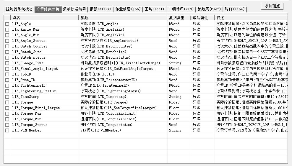 能夠采集車輛標識(VIN)、控制器信息、工具數(shù)據、參數(shù)集、作業(yè)信息、擰緊結果及報警等關鍵數(shù)據,覆蓋大部分擰緊工況,為后續(xù)擰緊質量追溯與工藝優(yōu)化提供可靠的數(shù)據基礎。
