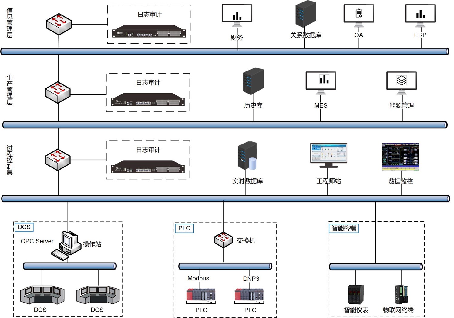 在信息管理層、生產(chǎn)管理層和過(guò)程控制層部署日志審計(jì),通過(guò)收集并分析系統(tǒng)日志等數(shù)據(jù),從而發(fā)現(xiàn)違反安全策略的行為。安全審計(jì)主要側(cè)重于事后分析,即當(dāng)發(fā)生安全事故或者發(fā)生違反安全策略的行為之后,通過(guò)檢查、分析、比較審計(jì)系統(tǒng)收集的數(shù)據(jù),從中發(fā)現(xiàn)違反安全策略的行為。