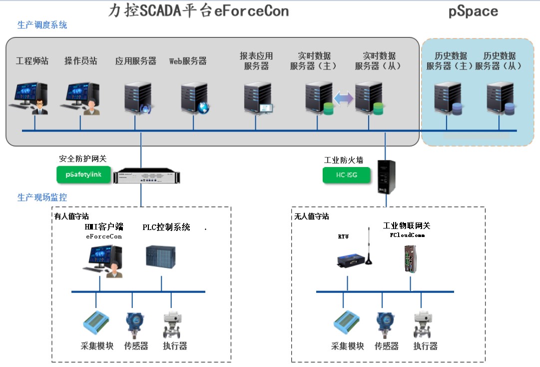 力控eForceCon SCADA系統(tǒng)調(diào)度平臺(tái)軟件應(yīng)用于中大型SCADA調(diào)度系統(tǒng),覆蓋從現(xiàn)場(chǎng)監(jiān)控站到調(diào)度中心,提供完整的生產(chǎn)信息采集與集成服務(wù),負(fù)責(zé)對(duì)整個(gè)系統(tǒng)的工藝生產(chǎn)進(jìn)行監(jiān)控管理和優(yōu)化決策,助力智慧市政、油氣生產(chǎn)物聯(lián)網(wǎng)、智慧礦山等行業(yè)領(lǐng)域智能管控平臺(tái)建設(shè),提升企業(yè)生產(chǎn)自動(dòng)化水平,達(dá)到提質(zhì)增效的重要目標(biāo)。同時(shí)可與力控企業(yè)級(jí)實(shí)時(shí)歷史數(shù)據(jù)庫(kù)pSpace產(chǎn)品無(wú)縫連接形成整體解決方案,為企業(yè)生產(chǎn)自動(dòng)化、數(shù)字化及管控一體化管理提供支撐。