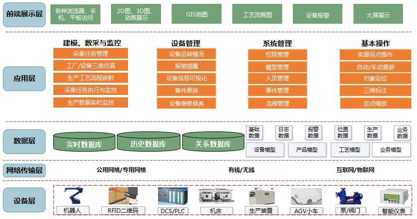 ● 三維可視化。通過(guò)構(gòu)建物理實(shí)體三維幾何模型,為各個(gè)場(chǎng)景如園區(qū)、建筑物、生產(chǎn)車間、生產(chǎn)設(shè)備、監(jiān)控設(shè)備等幾何模型添加信息屬性,并與相應(yīng)位置IOT數(shù)據(jù)結(jié)合,實(shí)現(xiàn)云端三維可視化。